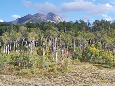 And, last, a couple views from the northern end of our weekend trip ~ from the West Elks range on the way over McClure Pass, between Paonia and Redstone, Colorado. I wish we could go back up next week; all these aspen will be changed to autumn gold by then!